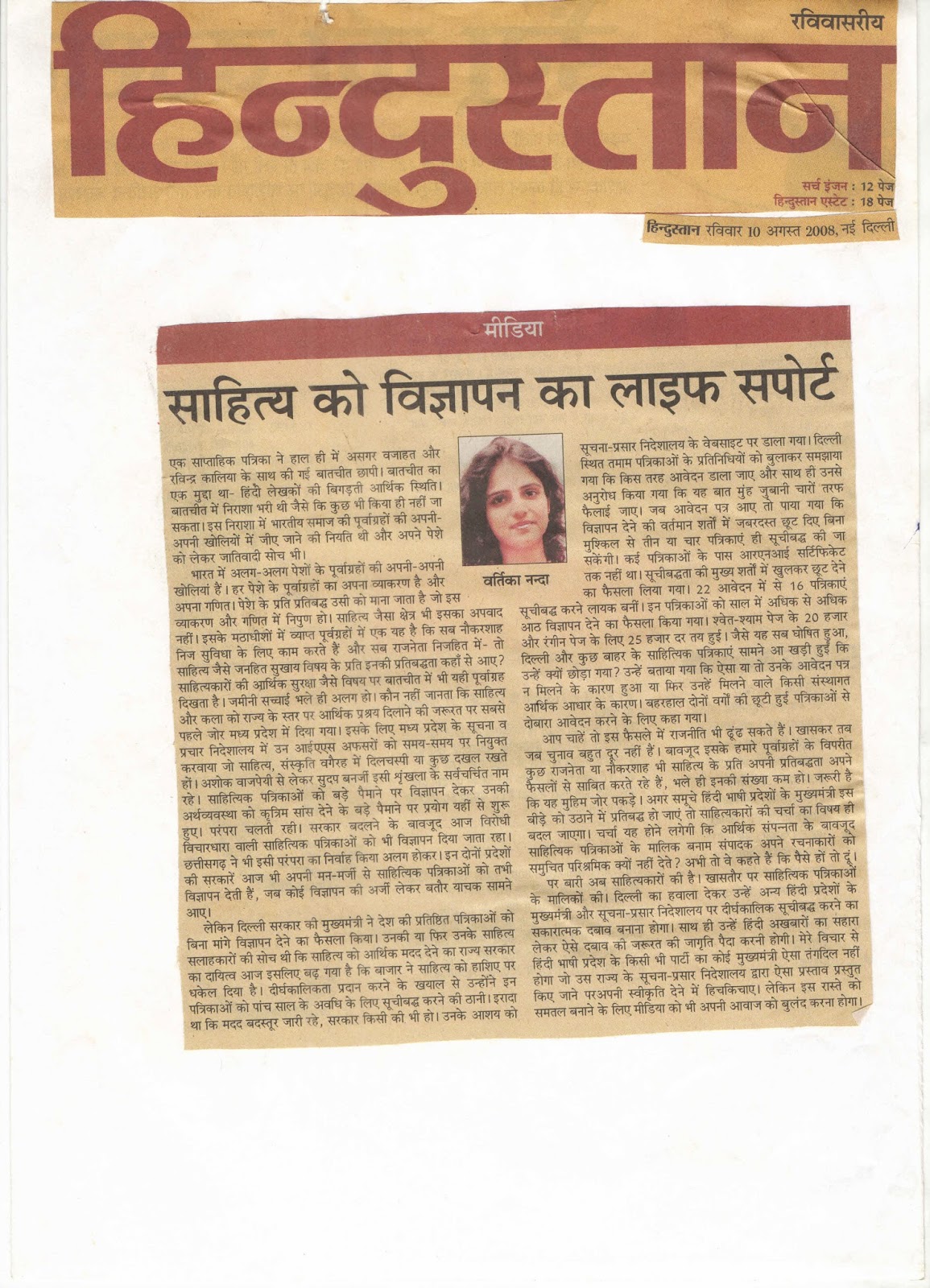 पर बारी अब साहित्यकारों की है। खासतौर पर साहित्यक पत्रिकाओं के मालिकों की। दिल्ली का हवाला देकर उन्हें अन्य हिंदी प्रदेशों की मुख्यमंत्री और सूचना और प्रचार निदेशालय पर दार्घकालिक सूचीबद्ध करने का सकारात्मक दबाव बनाना होगा। साथ ही उन्हें हिंदी अखबारों का सहारा लेकर ऐसे दबाव की जरूरत की जागृति पैदा करनी होगी। मेरे विचार से हिंदी भाषी प्रदेश के किसी भी पार्टी का कोई मुख्यमंत्री ऐसा तंगदिल नहीं होगा जो उस राज्य के सूचना-प्रचार निदेशालय द्वारा ऐसा प्रस्ताव प्रस्तुत किए जाने पर अपनी स्वीकृति देने में हिचकिचाए। लेकिन इस रास्ते को समतल बनाने के लिए मीडिया को भी अपनी आवाज को बुलंद करना होगा।